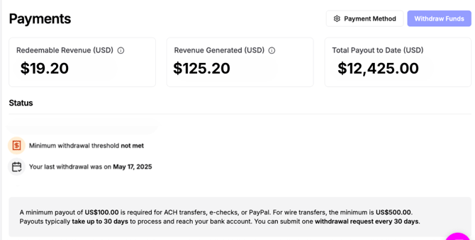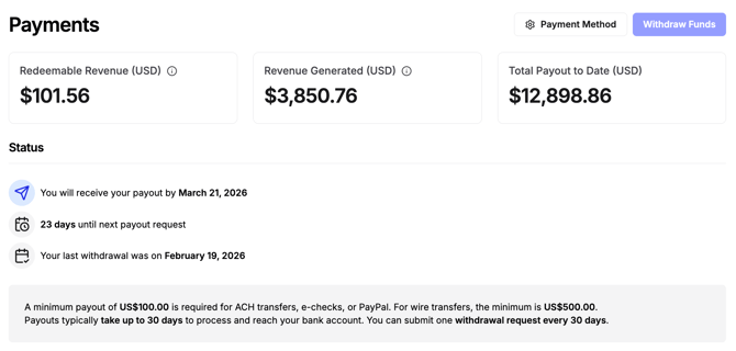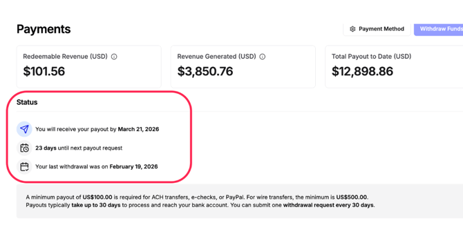 2. Once you've withdrawn funds, it will tell you when you'll receive your payout by, and also how many days until you can request your next payout.